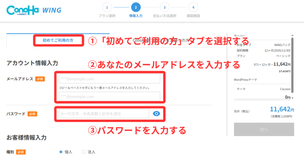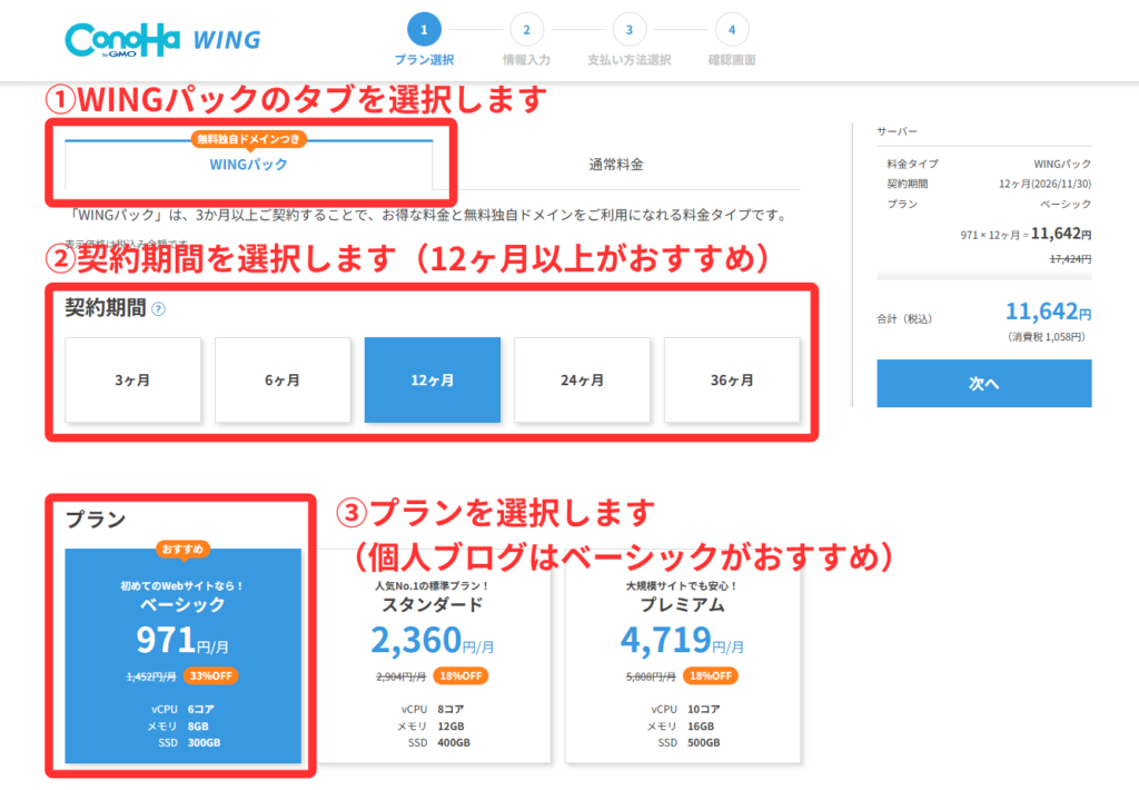 プラン選択の画面になりますので、下記のように選択していきましょう。