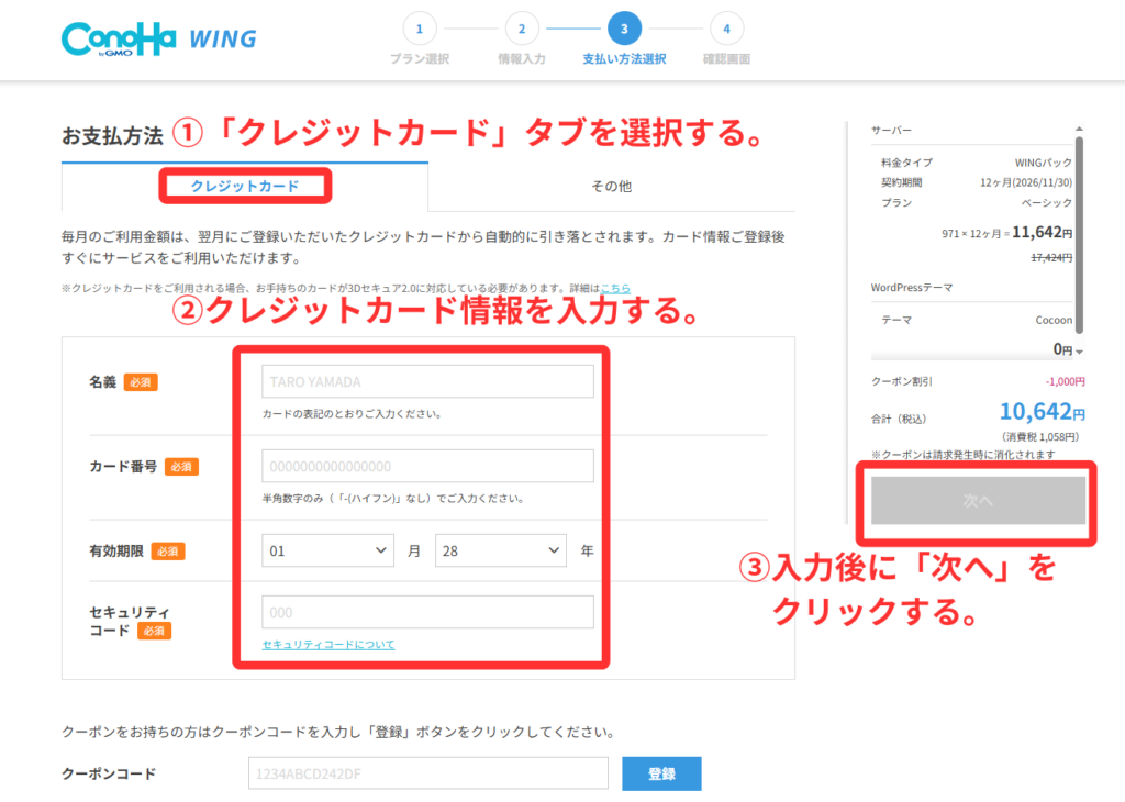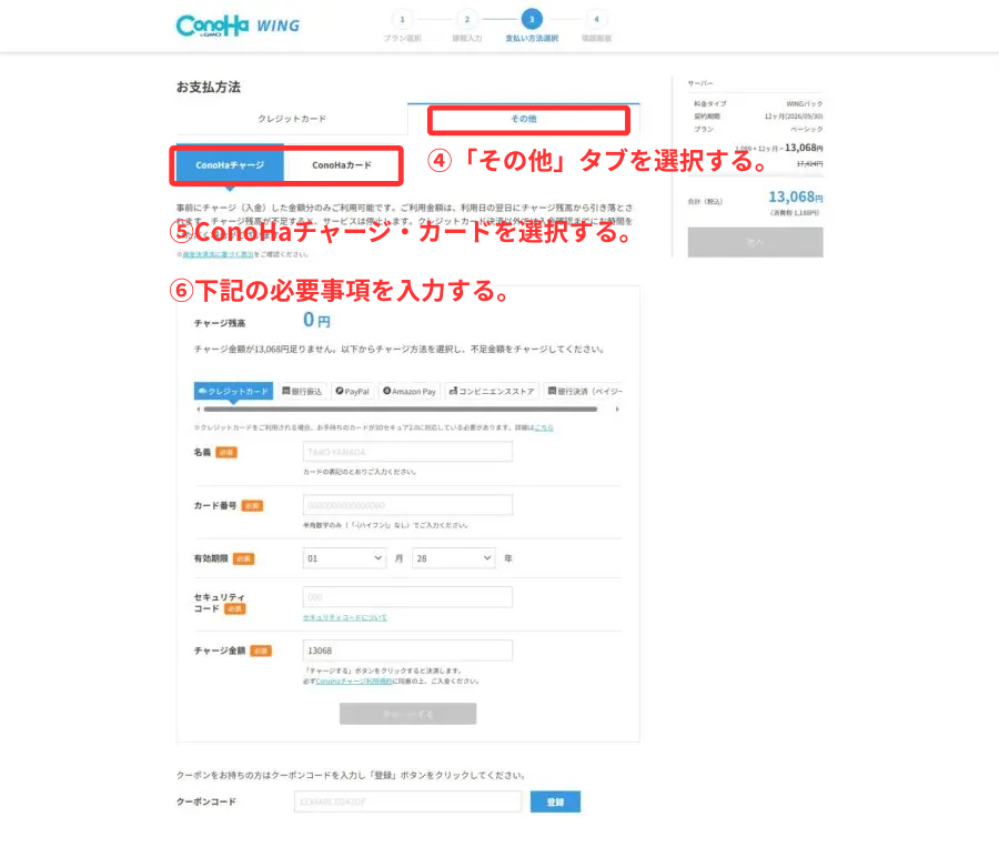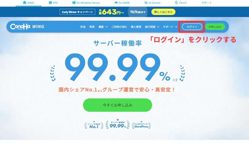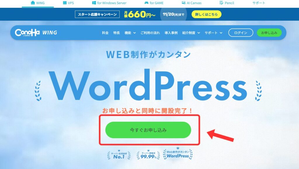 まずは、ConoHa WINGの公式サイトからレンタルサーバーの申し込みをしていきましょう。