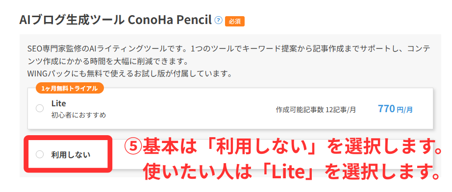 続いてConoHa WINGの「AIブログ生成ツール ConoHa Pencil」について、選択します。