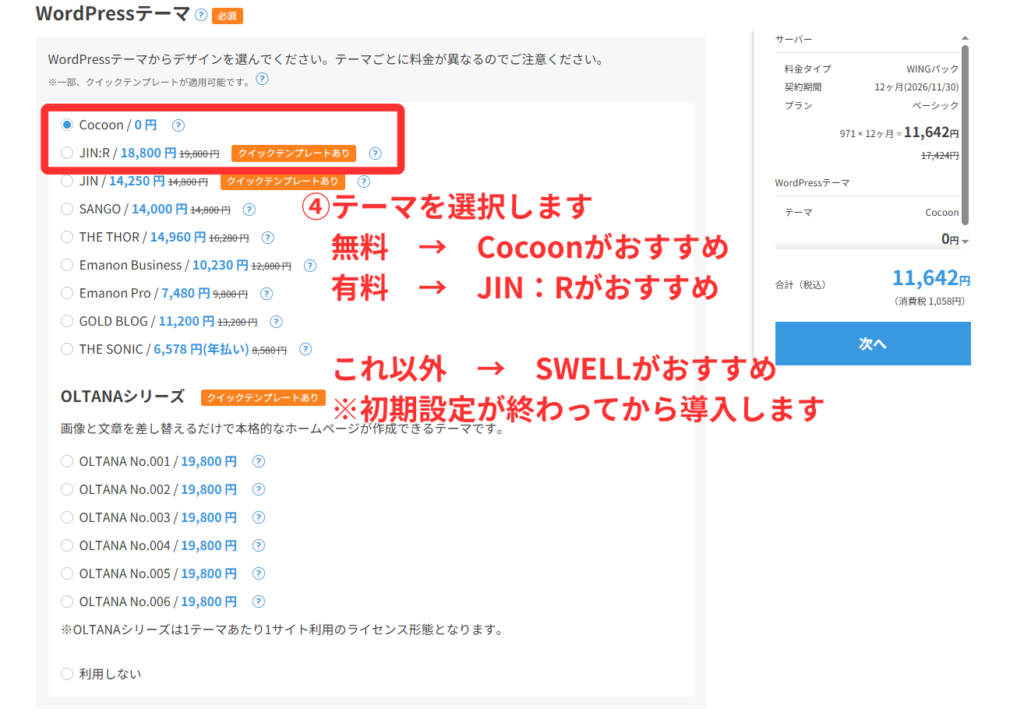 プラン選択の画面になりますので、下記のように選択していきましょう。