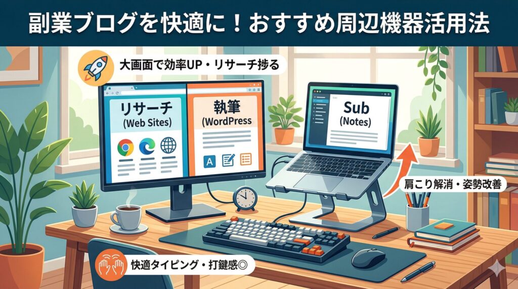 スタンド1台で姿勢が変わり、集中力が続く時間も伸びるため、副業ブログを長く続けるための最初の一手として非常に有効です。