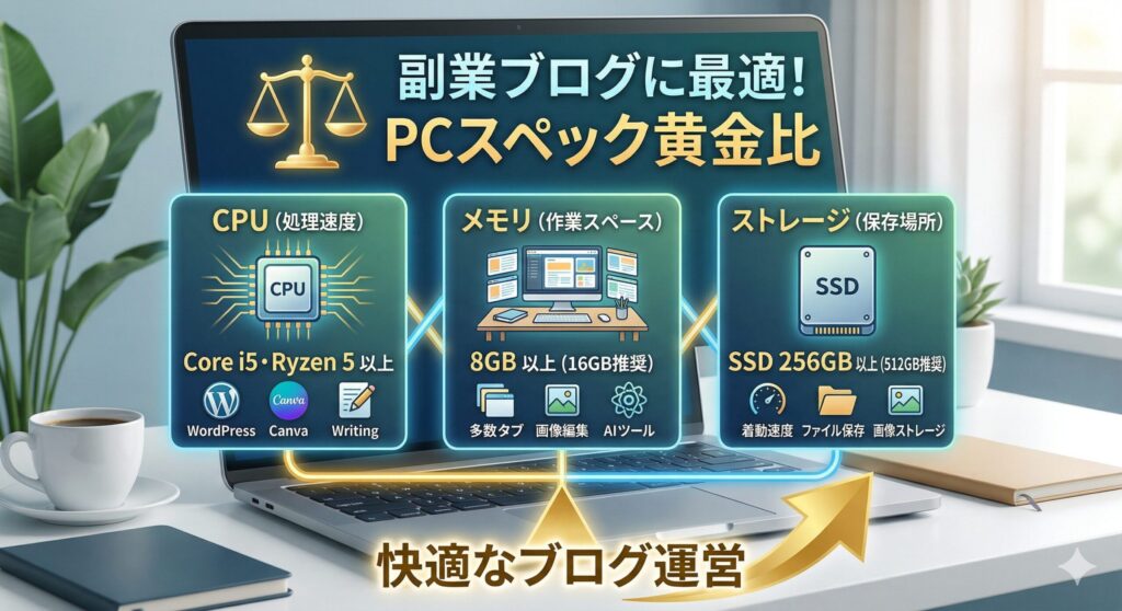 副業ブログに使うPCを選ぶとき、スペックの数値に迷う人は少なくありません。