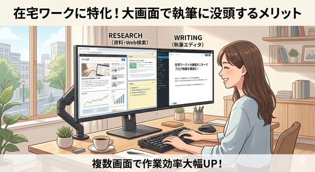 外部モニターを1台つなぐだけで、左画面でリサーチ・右画面で執筆という分割作業が可能になり、画面の切り替え回数が大幅に減ります。