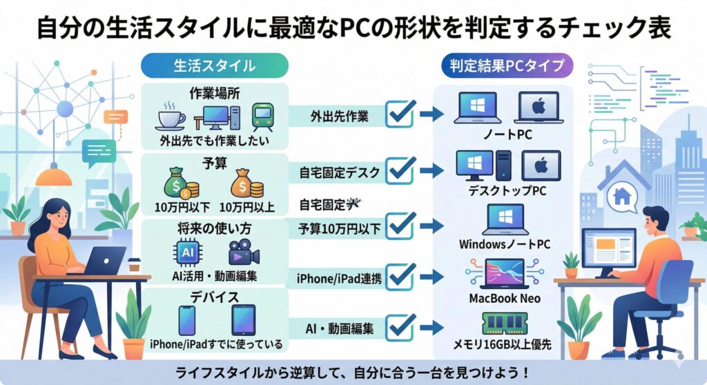 予算が10万円以下ならWindowsノート、Apple製品ユーザーならMacBook Neoが自然な選択になります。