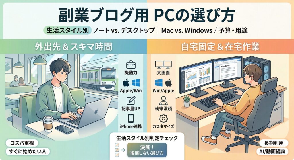 - 外出先でも書くならノートPC、自宅固定ならデスクトップも検討できる