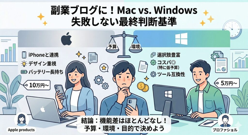 MacかWindowsかという問いは、副業ブログを始める多くの人が一度は迷う問題です。